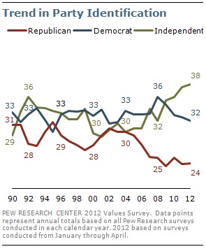 GOP = DEAD At around 20% (2013 PEW POLL similar to PEW 2011 POLL) = ROSS PEROT 4th or 5th PARTY was 19%