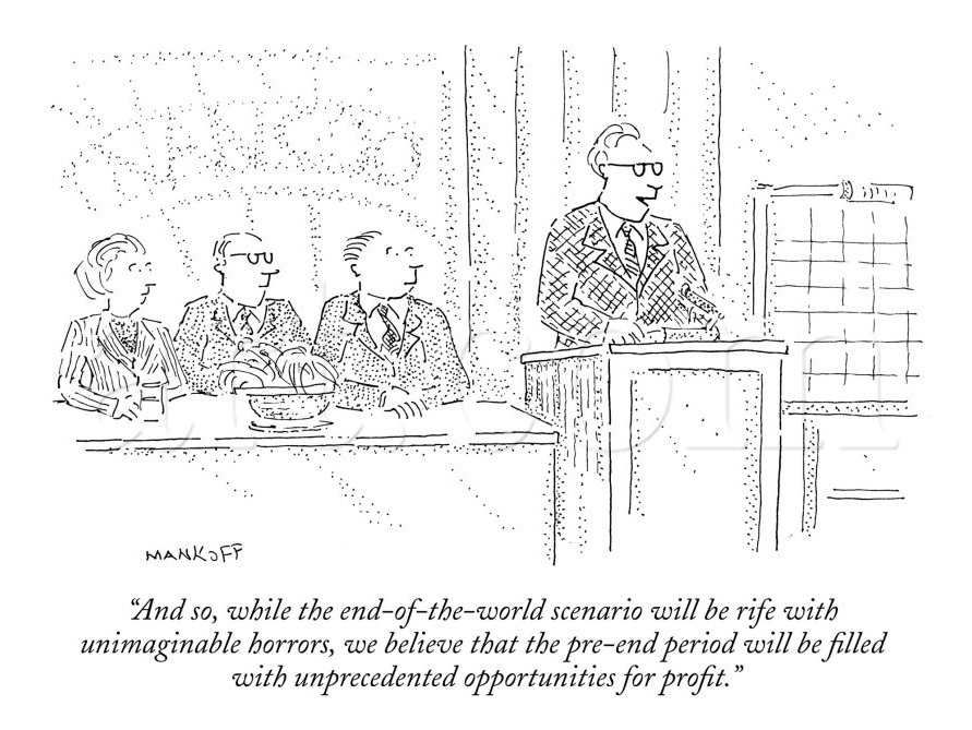 Robert Mankoff’s New Yorker cartoon of happy-go-lucky CEO of a too-big-to-fail Wall Street bank is at the podium saying, “While the end-of-the-world scenario will be rife with unimaginable horrors, we believe that the pre-end period will be filled with unprecedented opportunities for profit.”