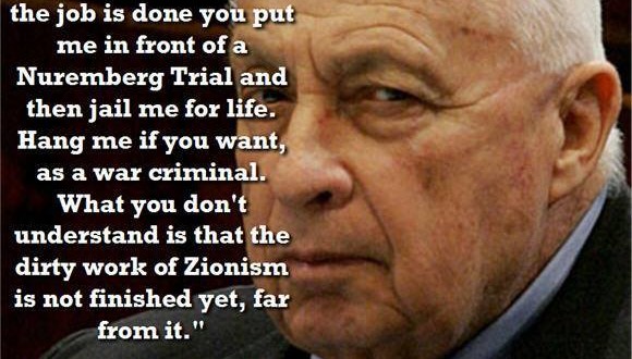 Ariel Sharon = embodied the pure, unmitigated evil of Zionism. He was a war criminal, a terrorist, a mass murderer, a torturer, a rapist = GENOCIDAL = One redeeming quality: He occasionally told the awful truth about himself and his country.