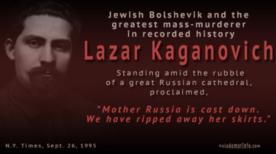 — Der Spiegel, Germany, page 151 — Kaganovich, a Stalin Jew implemented the Holocaust/Genocide on Russia’s and the Ukraine’s rural population. = Mass murder of 20 Million peasants. = LARGEST individual mass murder in the history of mankind.