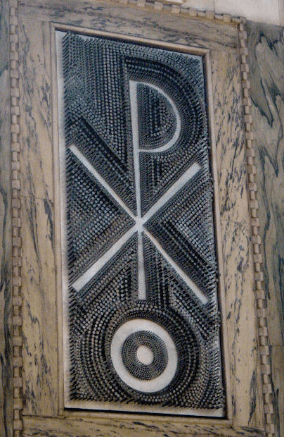 The monogram that looks like a combination of a P and an X is actually the first two letters of the Greek word for Christ – Chi (X) and Rho (P). The symbol was used by early Christians and is attributed to the Roman Emperor Constantine, who used it as a military symbol. You will often see it on banners in processions.