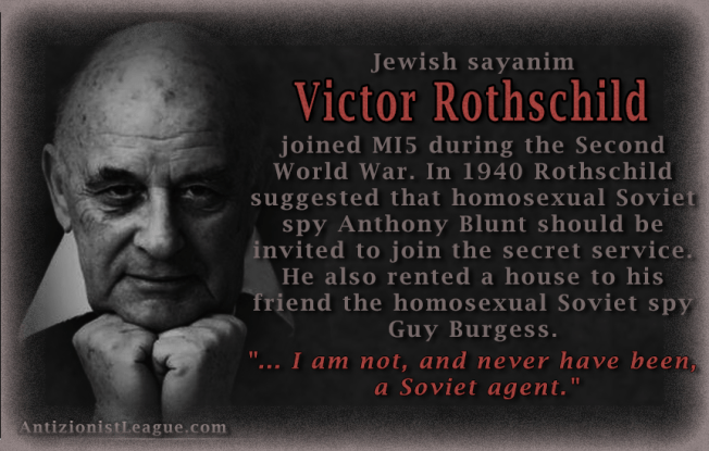 After WW II British King George VI, Liz’s father, sent ex-MI5 officer, Anthony Blunt, to the Kronberg Castle of Philip’s sister, Sophie, and her Nazi husband Prince Christoph of Hesse, to recover correspondence between the British royal family and these NAZI relatives. And Blunt was exposed as a member of a unit of the “KGB” within British Intelligence working with Lord Victor Rothschild. In fact it was a unit of the Brotherhood and, ultimately answerable to the KGB. Victor Rothschild, 3rd Baron Rothschild, (1910-1990), was an officer of the UK Security Service (MI5) during World War II that worked with a known KGB SPY and was likely one himself. He was born into Jewish family, but in adult life Rothschild declared himself to be an atheist. Rothschild was recruited to work for MI5 during World War II in roles including disinformation and espionage and was the head of the “explosives and sabotage section”. In 1993, after the dissolution of the Soviet Union, six retired KGB colonels, including Yuri Modin, the spy ring’s handler, alleged Rothschild was the “Fifth Man” saying, “Rothschild was the key to most of the Cambridge ring’s penetration of British intelligence…He had the contacts. He was able to introduce Burgess, Blunt and others to important figures in Intelligence such as Stewart Menzies, Dick White and Robert Vansittart in the Foreign Office…who controlled MI-6.”