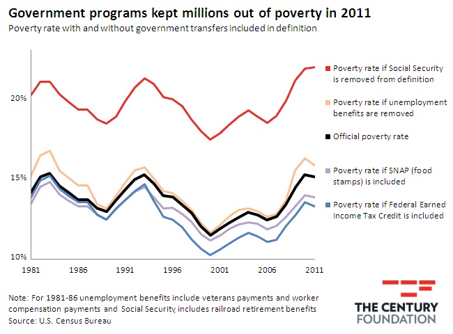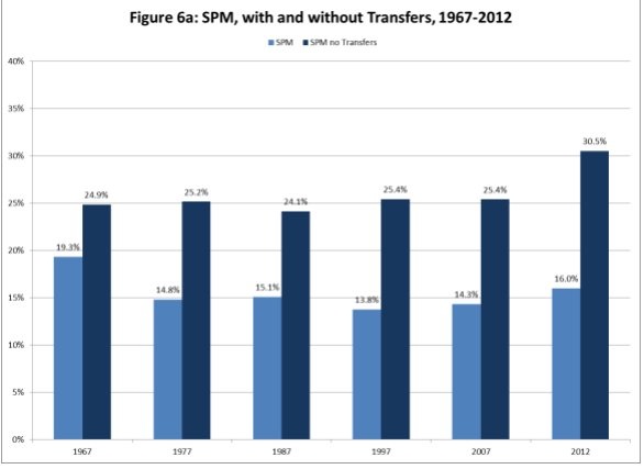 Government programs especially effective at reducing “deep poverty rate” = 50% OF POVERTY LINE = DOWN FROM 19.2% to 5.3%.