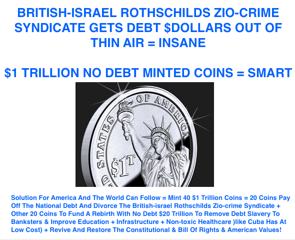Take the money power away from the BRITISH-ISRAEL ZIONIST CRIME SYNDICATE and put it in the hand of an American run NEW GOVERNMENT with all ZIONISTS INFLUENCE REMOVED including the FEDERAL RESERVE ROTHSCHILDS CENTRAL BANK & ITS IRS! = A PARASITIC ROBBING CANCER THAT BORROWED INSIDE OUR AMERICAN GOVERNMENT AND IS DESTROYING AMERICA & AMERICANS FROM THE INSIDE OUT.